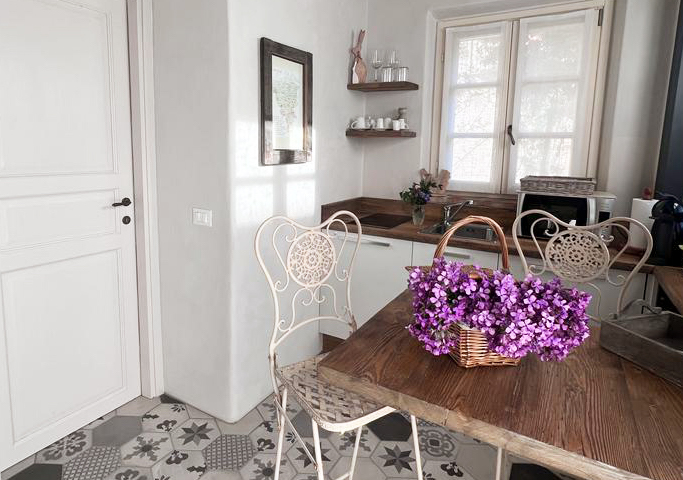 La Cà del Muscatè è un gioiello in miniatura, frutto di un recupero accurato, che ha saputo rispettare i muri in pietra e le antiche travi, sposandoli ad elementi di modernità come i pavimenti in resina o la scala in ferro grezzo, in un gioco di contrasti armoniosi.